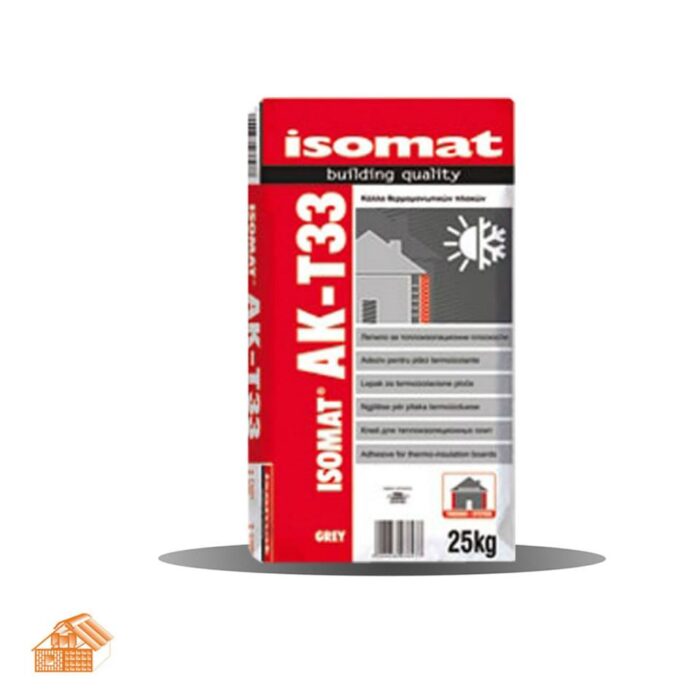 ISOMAT AK-T33 je cementni lepak za termoizolacione ploce. Obezbeduje jaku adheziju bez stvaranja pukotina na polistirenskim izolacionim plocama. ISOMAT AK-T33 se koristi za lepljenje termoizolacionih, polistirenskih ploca na cementne podloge.