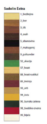 akacija, Ariš, Bela, Bezbojni, Bor, Crvena, ebanovina, Hrast, Mahagoni, Orah, Palisander, svetli hrast, Tik, Trešnja, Žuta |
