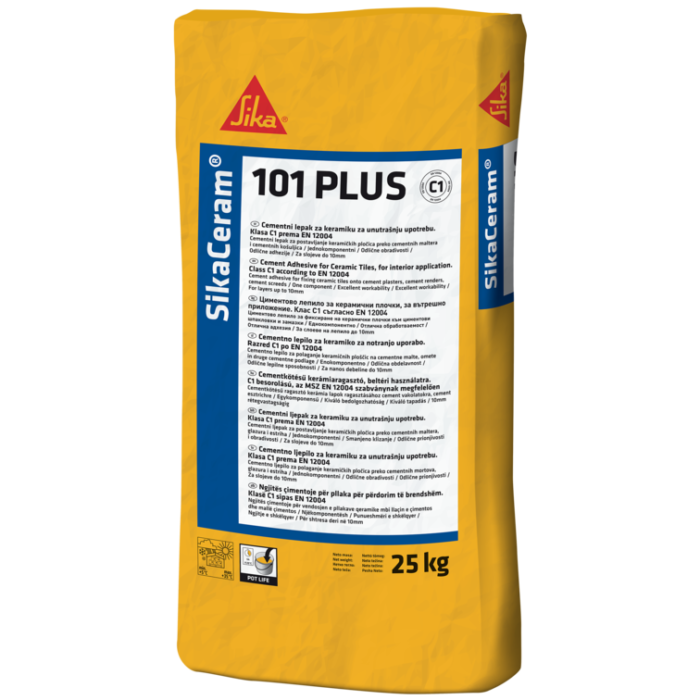 SikaCeram®-101 PLUS je pripremljena praškasta mešavina, veoma otpornih cemenata, sa sadržajem polimera, odabranih silikonskih/kvarcnih mineralnih punila sa specijalnim dodacima. Spreman za korišćenje uz dodatak vode. Može se koristiti za lepljenje keramičkih pločica na vertikalnim i horizontalnim unutrašnjim površinama.